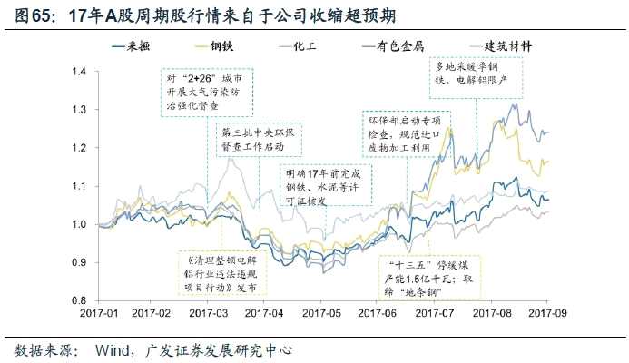 因此,我們看到13年之后A股周期股的投資邏輯不僅需要確認(rèn)“需求復(fù)蘇”、更需要確認(rèn)“供給收縮”,不僅需要確認(rèn)“貨幣環(huán)境放松”、更需要確認(rèn)“信用環(huán)境放松”。在17-18年全球周期股跟隨金屬價(jià)格、油價(jià)表現(xiàn)出超額收益的同時(shí),A股周期股跑輸。去杠桿背景之下,周期行業(yè)需求的可持續(xù)性存疑,A股周期股的結(jié)構(gòu)性機(jī)會(huì)來(lái)自于供給收縮超預(yù)期和信用環(huán)境寬松。雖然17年周期股需求一直表現(xiàn)不錯(cuò),但最大的行情機(jī)會(huì)出現(xiàn)在三季度,催化劑來(lái)自于環(huán)保核查與供給收縮政策超預(yù)期。18年上半年貨幣政策邊際放松,但周期股缺乏持續(xù)性的大機(jī)會(huì),更多來(lái)自于對(duì)“信用環(huán)境收緊”的擔(dān)憂(yōu)。