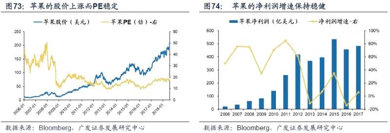 美股科技股的發(fā)展歷史悠久,許多公司已跨過(guò)快速成長(zhǎng)期收獲“馬太效應(yīng)”從而站上“浪潮之巔”,我們以剛剛市值突破萬(wàn)億美元的蘋(píng)果公司為例,由于2011年之后盈利已實(shí)現(xiàn)穩(wěn)態(tài),股價(jià)完全由業(yè)績(jī)驅(qū)動(dòng)、而PE估值始終保持在15-20的水平,已成為名副其實(shí)的“白馬成長(zhǎng)股”。