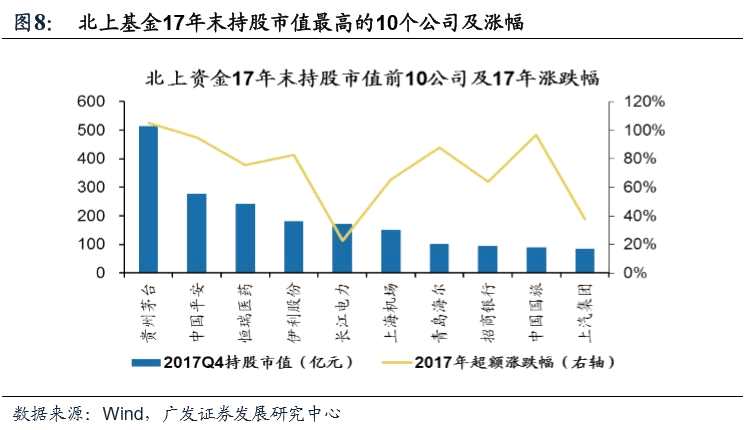 增量外資特定的風(fēng)格偏好也影響A股市場(chǎng)表現(xiàn),2017年以來(lái)北上資金對(duì)A股藍(lán)籌白馬股的市場(chǎng)表現(xiàn)起到了“推波助瀾”的作用。截止17年末北上資金持股市值最大的十只標(biāo)的普遍在17年收獲40%以上的漲幅,外資對(duì)于食品、醫(yī)藥等消費(fèi)股的偏好推升了2017年以來(lái)的消費(fèi)白馬行情。