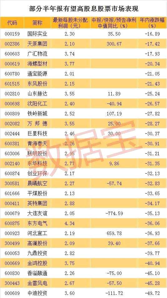 英力特能有如此表現(xiàn),一方面在于其實今年半年報首個高分紅股票,搶了頭炮;二是其股息率較高的因素,僅按照半年度分紅計算也能達到10%以上水平。那么,哪些股票半年報也可能達到這種分紅水平呢?不妨參照目前英力特的情況來進行篩選。