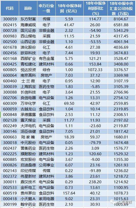 同證金公司持股類似是,中央?yún)R金持有的72只個股當(dāng)中,中報業(yè)績無一出現(xiàn)虧損。除了貴州茅臺上半年凈利潤達到157.64億元外,還有5家公司的盈利超過10億元,分別是萬華化學(xué)、??低暋㈥懠易?、露天煤業(yè)、西山煤電,2018年凈利潤分別為69.5億元、41.47億元、18.39億元、11.77億元、11.15億元。東方通的中報凈利最低,只有161萬元,中央?yún)R金是其第8大流通股東,持股數(shù)量為373萬股。