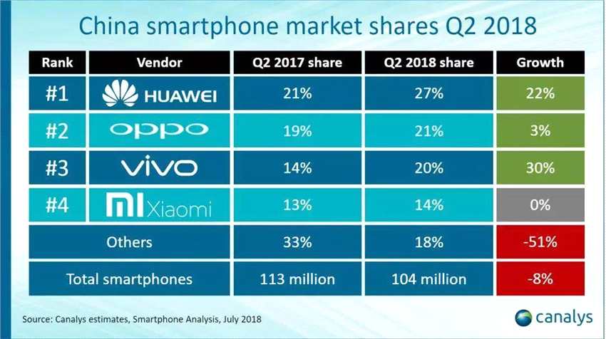 Canalys 提供的第二季度手機(jī)市場(chǎng)調(diào)研數(shù)據(jù)與 IDC 略有出入,但卻反映出榮耀對(duì)于小米的威脅。第二季度,華為占據(jù) 27% 的市場(chǎng)份額,根據(jù) 1.04 億的市場(chǎng)總銷量可以算得,華為總出貨量約為 2800 萬。Canalys 表示,榮耀占據(jù)了華為總銷量的 55%,由此得出華為銷量 1544 萬臺(tái)。而小米的總銷量,為只有 1456 萬臺(tái)。