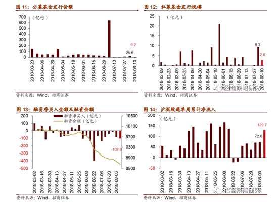 資金供給方面,8月6日-8月10日,公募基金發(fā)行6.2億份,較前期減少19.3億份;私募基金成立募資2.8億元,較前期減少6.4億元;融資客繼續(xù)凈賣出102.6億元,規(guī)模較前期增加16.4億元;截至2018年8月10日,融資余額為8662.1億元;外資流入規(guī)模明顯增大,陸股通全周凈買入129.7億元,較前期規(guī)模增加57.2億元。