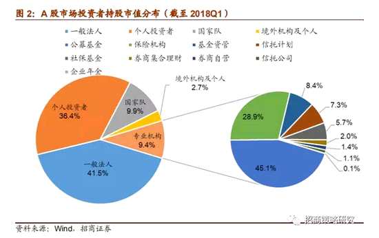 目前來看,個人投資者和一般法人仍然是A股市場最主要的兩類投資者,而各類機構(gòu)占比仍相對較低。截至2018年一季度末,一般法人占比約41.5%,個人投資者占比36.4%,合計占比77.9%。境內(nèi)外機構(gòu)投資者占比合計約22%,其中,國家隊持股占A股流通股市值比例為9.9%,國內(nèi)專業(yè)機構(gòu)持股占比9.4%,境外資金持股占比2.7%。