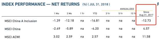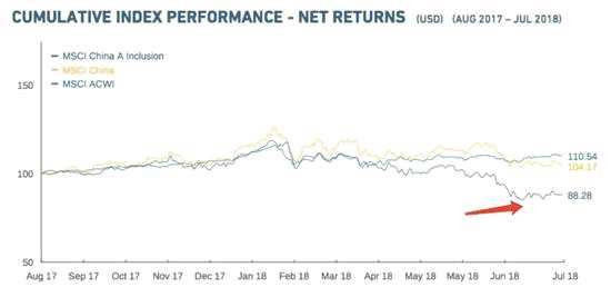 根據(jù)MSCI官網(wǎng)顯示,截至7月31日,反映納入MSCI新興市場指數(shù)的226只A股表現(xiàn)的MSCI China A Inclusion指數(shù)自2017年8月份以來,下跌了12.73%
