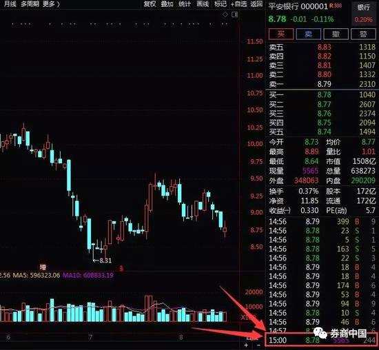 集合競(jìng)價(jià):深交所股票——【平安銀行(000001)、股吧】,14:57過(guò)后再無(wú)交易,直到15:00收盤,才有一筆交易。