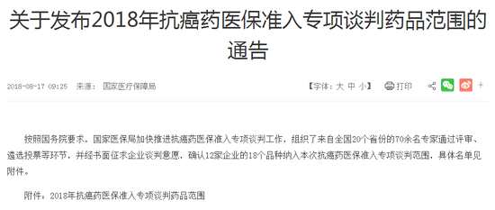 8月17日,國家醫(yī)療保障局印發(fā)《關(guān)于發(fā)布2018年抗癌藥醫(yī)保準入專項談判藥品范圍的通告》。通告指出,按照國務(wù)院要求,國家醫(yī)保局加快推進抗癌藥醫(yī)保準入專項談判工作,組織了來自全國20個省份的70余名專家通過評審、遴選投票等環(huán)節(jié),并經(jīng)書面征求企業(yè)談判意愿,確認12家企業(yè)的18個品種納入本次抗癌藥醫(yī)保準入專項談判范圍。