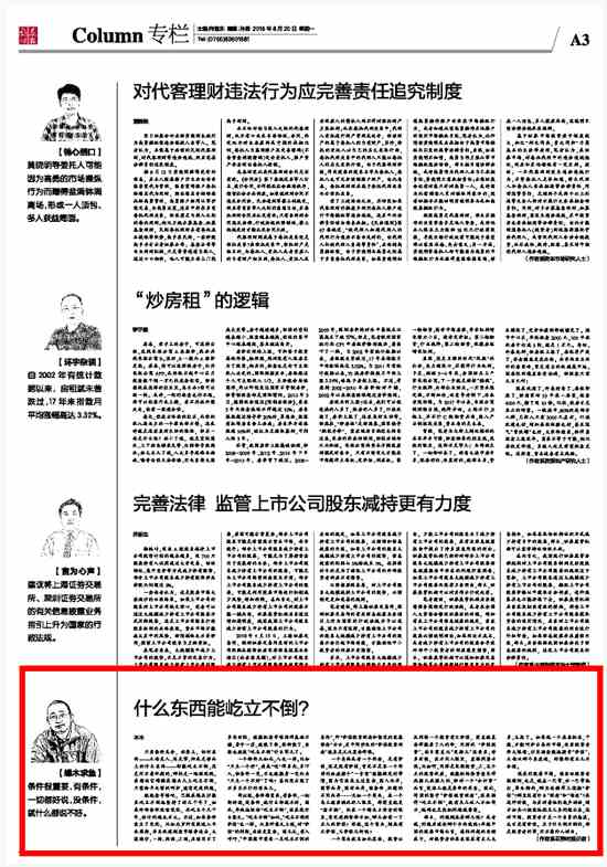8月16日,頭版刊發(fā)董少鵬評論文章稱,“中國股市需要一點(diǎn)屹立不倒的東西”——由于一些因素的影響,投資者無心戀戰(zhàn),股市成交量較低。面對一時(shí)的壓力,我們要堅(jiān)守住中國股市發(fā)展所需要的“屹立不倒的東西”,即價(jià)值投資理念和堅(jiān)定的發(fā)展信念。