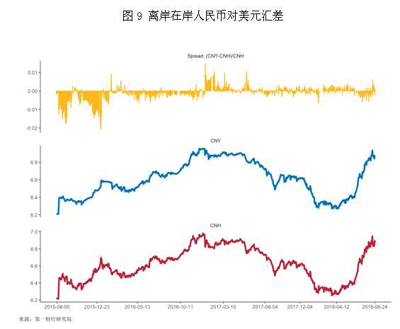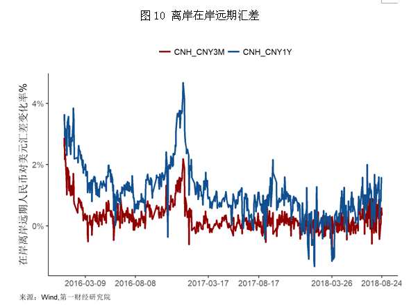 第三個維度是從離岸在岸市場的差異來判斷市場情緒。由于離岸市場相較于在岸市場更市場化,如果市場存在貶值預期,而在岸市場不能通過價格的波動釋放預期,那么投資者可以在兩個市場進行套利。