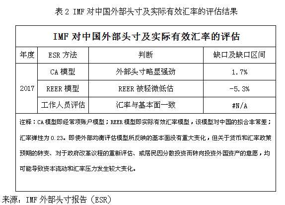 此外,2018年IMF最新的外部頭寸(ESR)報告顯示,根據(jù)外部均衡評估法的實際有效匯率指數(shù)回歸估計,中國的實際有效匯率與基本面和可取政策所對應的水平相比低5.3%。但該方法對中國的適用性較弱。總體而言,在經常賬戶稍顯強勁的情況下,由于中國的經常賬戶相對于實際有效匯率的彈性較低(0.23),IMF認為中國匯率水平與基本面保持一致(表2)。