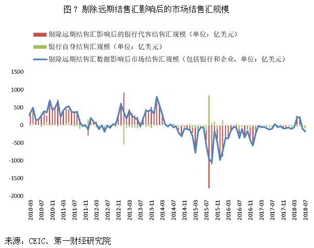 第一個維度能準確反映當期市場參與者的結售匯意向。當結售匯讀數(shù)為正值時,說明市場更愿意將手中的美元結為人民幣,這時市場上美元供大于求,對人民幣預期持樂觀情緒;當結售匯讀數(shù)為負值時,說明市場更愿意將手中的人民幣售出為美元,這時市場上美元供不應求,對人民幣預期持悲觀情緒。由于相關部門公布的銀行結售匯數(shù)據(jù)中包括即期和遠期結售匯數(shù)據(jù),因此,將遠期因素剔除才能更好地觀測當期市場情緒。2018年以來剔除遠期結售匯影響后的市場結售匯數(shù)據(jù)顯示,1~3月市場對人民幣持悲觀情緒,4~5月市場對人民幣情緒轉為樂觀,6~7月情緒再度反轉,但7月結售匯逆差遠小于2016年下半年,也就是說當前市場的悲觀情緒遠不及2015年和2016年下半年(圖7)。