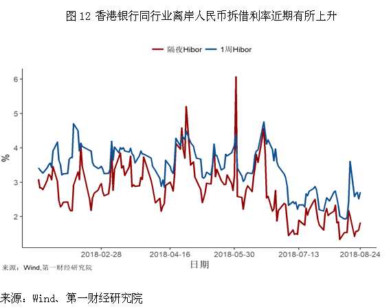 從2018年以來離岸在岸人民幣匯差的指標看,今年以來兩個市場的匯差非常小,7月以來離岸在岸人民幣匯差出現(xiàn)倒掛,說明在岸人民幣對美元有貶值壓力,不過倒掛幅度要遠小于2015年下半年。(圖9)2015年“8·11匯改”后,曾出現(xiàn)過離岸在岸較大的匯差,當時投資者通過在境內購買遠期外匯合約(DF),到離岸市場賣出無本金交割遠期外匯合約(NDF),到期后,把在岸市場低價購買的美元,在離岸市場高價賣出,這種套利表現(xiàn)為離岸在岸遠期匯差走闊,但如圖10所示,2018年并沒有產生該現(xiàn)象。還有一種套利方法是,在離岸市場借入人民幣,然后換匯為美元,在人民幣貶值后賣出美元換回人民幣,用人民幣還款,從而套利,這樣的套利會使香港同業(yè)拆借市場上離岸人民幣的拆借利率大幅飆升,不過2018年以來也沒有出現(xiàn)Hibor飆升至2015~2016年超過20%的現(xiàn)象(圖11)。