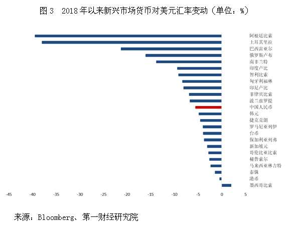 放眼全球匯率市場,年初以來大部分發(fā)達國家及新興國家貨幣均對美元出現(xiàn)了貶值,人民幣對美元貶值5.53%,相對于其他貨幣,人民幣依然保持強勢。在主要發(fā)達國家貨幣中,瑞典克朗、澳大利亞元、新西蘭元以及英鎊對美元的貶值幅度均大于人民幣(圖2)。在新興市場國家貨幣中,阿根廷比索、土耳其里拉、巴西雷亞爾、俄羅斯盧布、南非蘭特均貶值14%以上(圖3)。