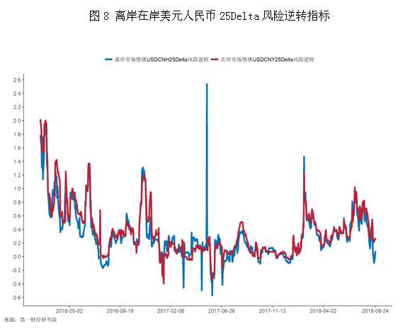 第二個維度是從期權衍生品入手觀測市場情緒,該指標的優(yōu)點在于能量化市場情緒的強弱且具有前瞻性,缺點在于外匯期權衍生品的市場參與者比外匯市場參與者更少,因此,該指標的樣本代表性弱。其中25Delta風險逆轉指標的讀數(shù)大于0時,表示市場看跌人民幣對美元匯率,讀數(shù)越大即看跌情緒越強烈,當讀數(shù)小于0時,表示市場看漲人民幣對美元匯率,讀數(shù)越小則看漲情緒越強烈。2018年以來,離岸和在岸25Delta風險逆轉指標在大部分時間段均處于正值,說明市場對人民幣有看跌情緒,但情緒悲觀的程度遠低于2016年(圖8)。