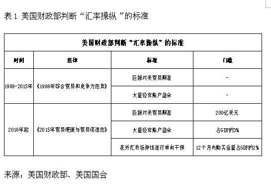 關于匯率操縱,美國現(xiàn)行的法律框架是2016年實施的《2015年貿易便捷與貿易促進法案》(簡稱“法案”),其中第701條是美國判定一國為“匯率操縱國”的法律依據(jù)。根據(jù)該法第701條(a)(2)(A)(ii)條款,當一國滿足以下三個標準時會被認定為“匯率操縱國”: (1)存在巨額對美貨物貿易順差;(2)存在大量的經常賬戶盈余;(3)在外匯市場持續(xù)進行單向干預。在2016年4月29日美國財政部發(fā)布的報告中,明確了法案中三個標準的量化門檻(表1)。目前中國顯然不符合第二條和第三條標準,因此不能被認定為“匯率操縱國”。