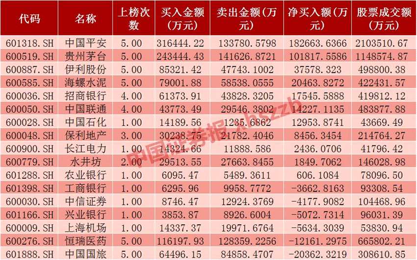 Choice數(shù)據(jù)顯示,8月20日-8月24日,兩市共32只個股躋身滬股通、深股通十大活躍股榜單,其中滬市的中國平安、貴州茅臺、伊利股份、海螺水泥、恒瑞醫(yī)藥、中國國旅均5次上榜,招商銀行和中國聯(lián)通也4次上榜;深市的五糧液、【美的集團(000333)、股吧】、萬科A、格力電器、??低暰?次上榜,平安銀行、立訊精密4次上榜。