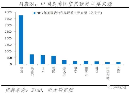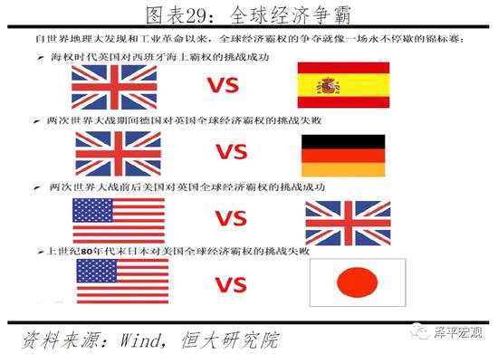 2017年中國、美國GDP規(guī)模為12、19萬億美元,分別占全球經(jīng)濟(jì)比重15%、24%,而中國14億人口,經(jīng)濟(jì)以6%以上的速度增長,美國3.2億人口,經(jīng)濟(jì)以2%左右的速度增長,大約過10年,即2027年前后中國經(jīng)濟(jì)規(guī)模有望超過美國。二戰(zhàn)以來,美國從來沒有遇到過這樣的對手,80年代日本在巔峰時期經(jīng)濟(jì)規(guī)模占美國的40%。
