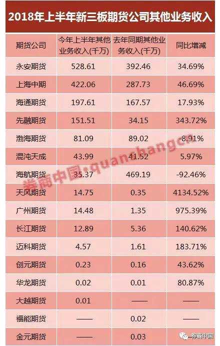 16家新三板期貨公司中,有13家披露了去年和今年上半年的其他業(yè)務收入(風險管理業(yè)務收入在報表中主要以其他業(yè)務收入體現(xiàn)),其中11家同比增長。其他業(yè)務收入過億元的有10家,其中4家收入超過10億元,永安期貨、上海中期、海通期貨以及先融期貨,分別為52.86億元、42.21億元、19.76億元、15.15億元。