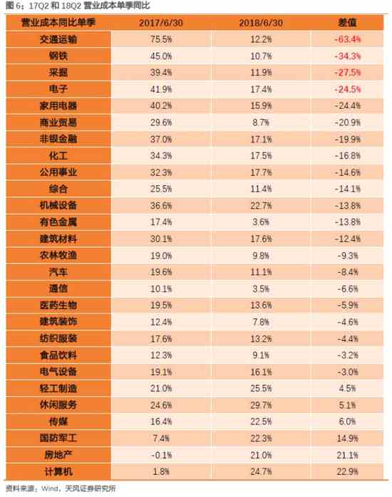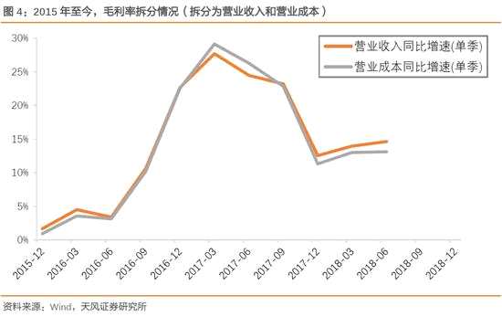 如果更進(jìn)一步將毛利率拆分為營業(yè)收入和營業(yè)成本,從收入的角度來說,非金融A股的單季度營收增速從17Q4開始,已經(jīng)出現(xiàn)了比較明顯的下臺(tái)階,17Q3、17Q4、18Q1、18Q2分別為23.20%、12.54%、13.99%、14.62%。但是反觀成本端,下滑的速度更加顯著,17Q3、17Q4、18Q1、18Q2分別為22.83%、11.32%、13.00%、13.10%。
