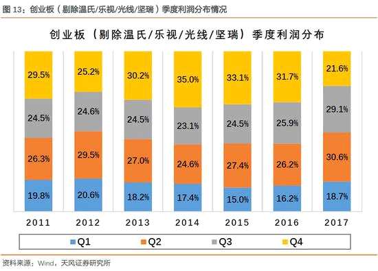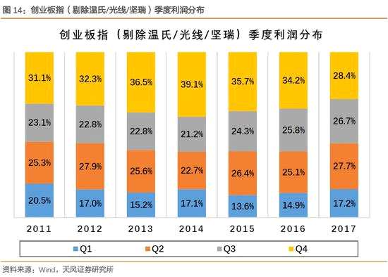 創(chuàng)業(yè)板和創(chuàng)業(yè)板指,四個(gè)季度的利潤總額的分布,一般情況下表現(xiàn)為:Q4>Q2/Q2>Q1,Q3的占比在25%左右,比較穩(wěn)定。近三年,創(chuàng)業(yè)板與創(chuàng)業(yè)板指Q3單季凈利潤與上半年凈利潤(Q1+Q2)的比值分別為59.2%和61.6%。