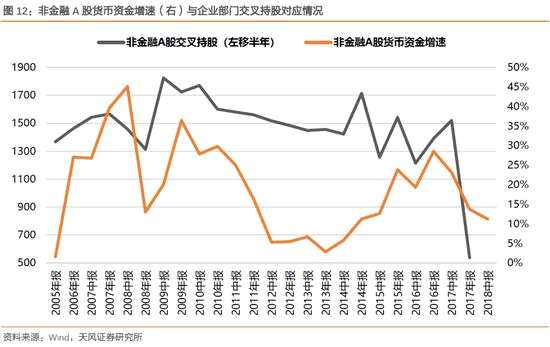 于是我們可以看到一組數(shù)據(jù),當(dāng)非金融A股的貨幣資金增速下行的時(shí)候,未來一段時(shí)間企業(yè)部門交叉持股的數(shù)量會(huì)顯著下降,也會(huì)伴隨市場的下跌。相反,當(dāng)非金融A股的貨幣資金增速上行的時(shí)候,未來一段時(shí)間企業(yè)部門交叉持股的數(shù)量將顯著上升,同時(shí)也會(huì)伴隨市場的上漲。因此,18年中報(bào)的數(shù)據(jù),再次驗(yàn)證了這樣的邏輯,當(dāng)過去3個(gè)季度企業(yè)部門貨幣資金增速連續(xù)下降之后,我們在今年上半年看到了企業(yè)部門大量甩賣股票的行為(交叉持股數(shù)量大幅下降)。