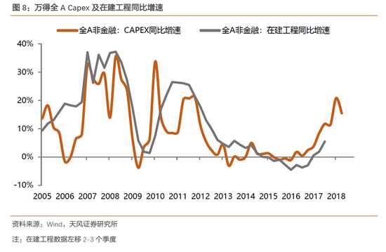 所以,當(dāng)我們預(yù)判了在建工程這一蓄水池的水位是升還是降,就能對產(chǎn)能周期,從而總資產(chǎn)周轉(zhuǎn)率的方向有一個(gè)大致的判斷了。那么我們就需要找到一個(gè)“在建工程”的領(lǐng)先指標(biāo)。從歷史數(shù)據(jù)和邏輯上來說,現(xiàn)金流量表構(gòu)成的“資本開支”是“在建工程”的一個(gè)不錯(cuò)的領(lǐng)先指標(biāo),領(lǐng)先周期在2-3個(gè)季度。