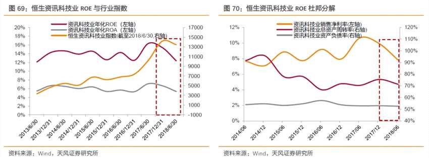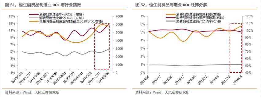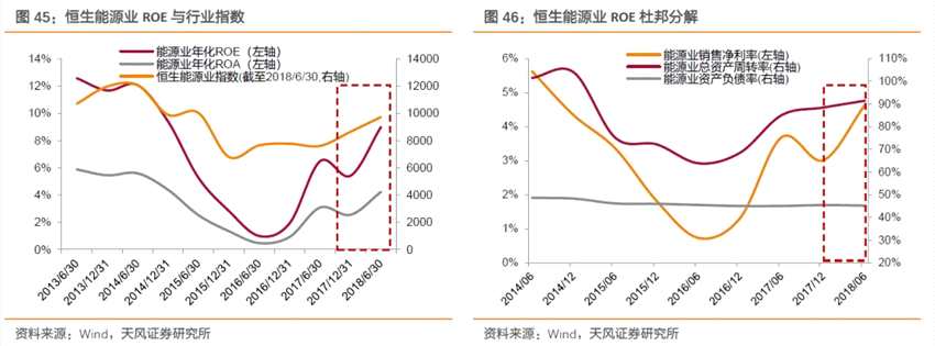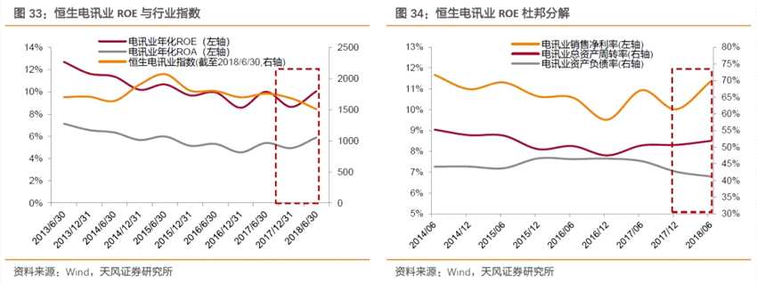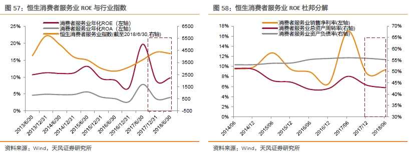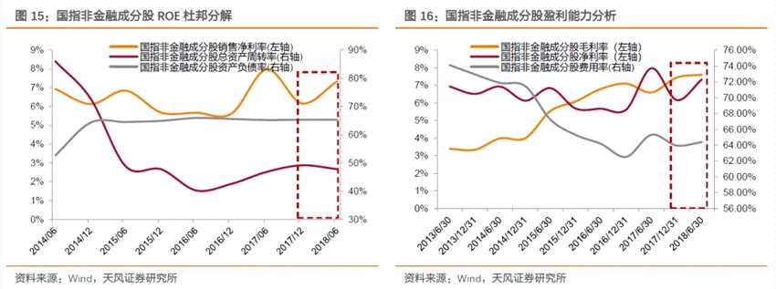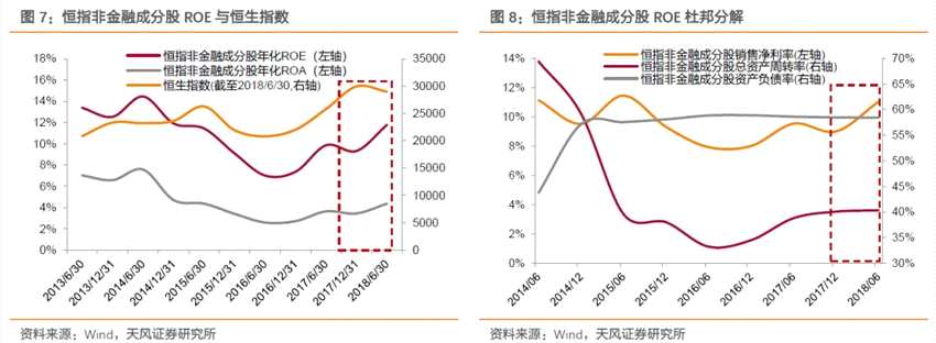 從ROE的杜邦分析來看,銷售凈利率提高成為ROE抬升主要驅(qū)動力。我們通過杜邦分析對全部港股非金融企業(yè)ROE進(jìn)行拆解,進(jìn)一步探究中報(bào)ROE抬升的驅(qū)動因素。根據(jù)杜邦分析定義,ROE可以拆分為銷售凈利率×總資產(chǎn)周轉(zhuǎn)率×權(quán)益乘數(shù),同樣為了統(tǒng)一口徑,我們將中報(bào)總資產(chǎn)周轉(zhuǎn)率進(jìn)行了年化處理,并用資產(chǎn)負(fù)債率代替權(quán)益乘數(shù)以便直觀比較。具體數(shù)據(jù)來看,全部港股非金融企業(yè)18年中報(bào)銷售凈利率、總資產(chǎn)周轉(zhuǎn)率、資產(chǎn)負(fù)債率分別為8.58%、42.66%、62.02%,17年年報(bào)三者分別為7.60%、44.56%、61.85%,其中銷售凈利率出現(xiàn)顯著上升,杠桿率水平保持相對穩(wěn)定,總資產(chǎn)周轉(zhuǎn)率有所下降;而相比于17年中報(bào),三者基本保持穩(wěn)中有增,凈利潤率的持續(xù)增長成為ROE抬升的主要驅(qū)動。