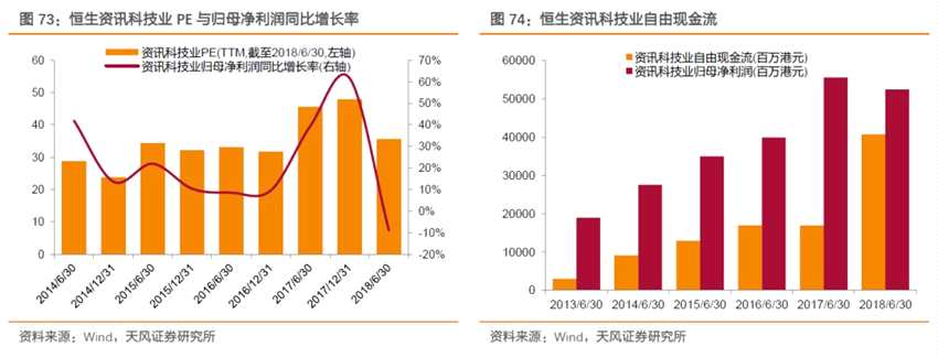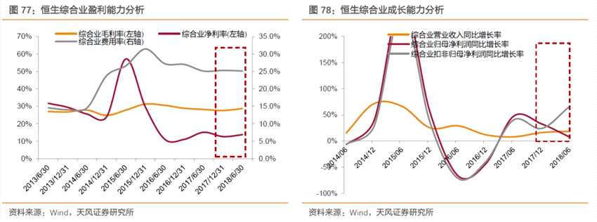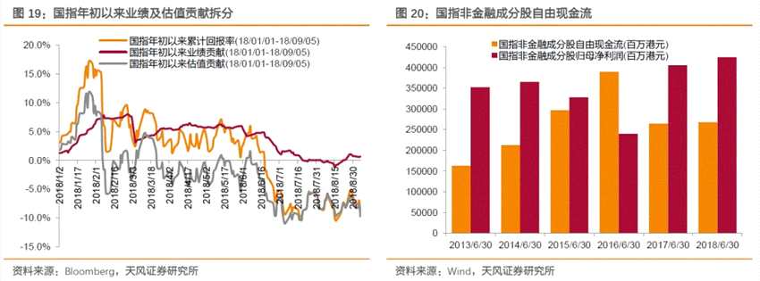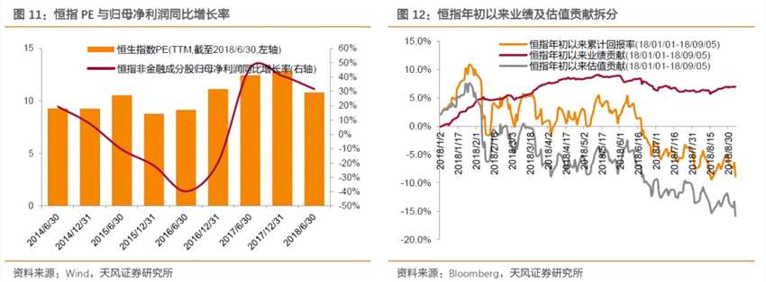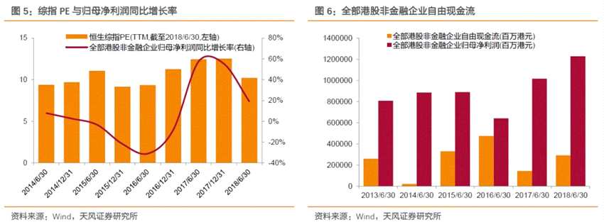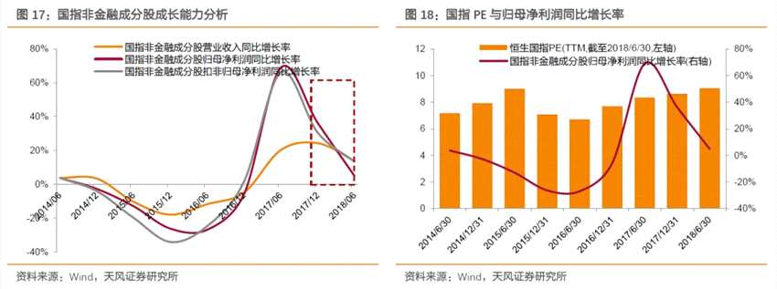 綜指中報(bào)PE大幅回落,業(yè)績支撐仍在,市場對盈利成長性的擔(dān)憂或成為拖累估值主要因素。截至18/6/30,恒生綜合指數(shù)PE為10.20,相比17年年末下降2.31,已接近近五年低位水平。從目前已披露的港股18年中報(bào)數(shù)據(jù)來看,港股盈利水平并未惡化,業(yè)績對行情支撐能力仍在,但估值端出現(xiàn)明顯下滑。進(jìn)一步比較恒生綜合指數(shù)PE及港股非金融企業(yè)歸母凈利潤同比增長率,發(fā)現(xiàn)兩者拐點(diǎn)表現(xiàn)出較強(qiáng)相關(guān)性,市場對盈利成長性的擔(dān)憂或?qū)⒊蔀橥侠鄹酃晒乐抵饕蛩亍?/p>