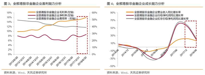 盈利能力來看,港股非金融企業(yè)毛利率顯著改善,費(fèi)用率繼續(xù)下降,推動凈利潤率繼續(xù)上行。18年上半年港股非金融企業(yè)凈利潤率為8.58%,相比17年同期(8.33%)與16年同期(6.26%)穩(wěn)步上升。港股非金融企業(yè)18年上半年凈利潤率的提升源于成本與費(fèi)用端的雙重改善。結(jié)合行業(yè)數(shù)據(jù)來看,我們并沒有看到原材料價(jià)格上升對中下游上市公司業(yè)績的顯著影響。但隨著資金政策收緊影響逐步擴(kuò)散,中美貿(mào)易摩擦的不斷升級,以及消費(fèi)和投資端表現(xiàn)越發(fā)低迷,下半年盈利指標(biāo)能否繼續(xù)向好,尚有待觀察。