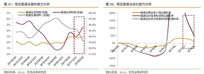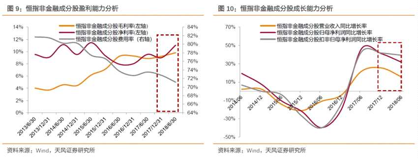 恒指、國指非金融成分股18年中報(bào)表現(xiàn)與全部港股非金融企業(yè)基本一致,凈利率改善拉動ROE上升。從恒指與國指的非金融成分股來看,兩大指數(shù)非金融成分股18年中報(bào)表現(xiàn)與前文全部港股非金融公司表現(xiàn)基本一致。中報(bào)同期數(shù)據(jù)來看,恒指非金融成分股16至18年中報(bào)年化ROE分別為7.00%、9.85%、11.77%;國指非金融成分股16至18年中報(bào)年化ROE分別為7.44%、11.93%、11.46%,總體穩(wěn)中向好。結(jié)合杜邦分析看,凈利率改善同樣是兩指非金融成分股ROE向好的主要原因,恒指、國指非金融成分股18年中報(bào)凈利率分別為11.04%、7.33%,較17年年報(bào)分別增長2.03%、1.17%,但凈利潤同比增速也都有所放緩,預(yù)計(jì)下半年兩大指數(shù)同樣將面對市場壓力。