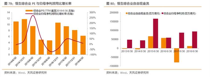 結(jié)合自由現(xiàn)金流與歸母凈利潤數(shù)據(jù)來看,不同恒生行業(yè)之間差別較為明顯,這與行業(yè)自身的經(jīng)營特點(diǎn)有關(guān)??紤]到現(xiàn)金流數(shù)據(jù)受企業(yè)經(jīng)營活動的季節(jié)性影響較大,此處我們僅對各恒生行業(yè)13年至今的上半年度數(shù)據(jù)進(jìn)行比較。從統(tǒng)計(jì)結(jié)果來看,綜合業(yè)、地產(chǎn)建筑業(yè)和工業(yè)18年上半年自由現(xiàn)金流數(shù)據(jù)相對17年同期出現(xiàn)明顯改善;而電訊業(yè)與能源業(yè)18年中報(bào)自由現(xiàn)金流有所回落。