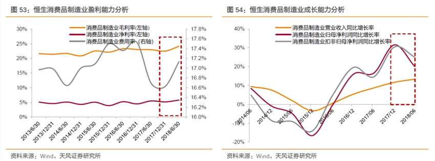 盈利能力來看,港股非金融企業(yè)毛利率顯著改善,費(fèi)用率繼續(xù)下降,推動凈利潤率繼續(xù)上行。18年上半年港股非金融企業(yè)凈利潤率為8.58%,相比17年同期(8.33%)與16年同期(6.26%)穩(wěn)步上升;港股非金融企業(yè)毛利潤率也從16年同期的14.22%,17年同期的14.76%,提升到目前的15.92%,成本端存在明顯改善。費(fèi)用端來看,16年至18年中報(bào),港股非金融企業(yè)的期間費(fèi)用率(期間費(fèi)用包括管理費(fèi)用、銷售費(fèi)用、財(cái)務(wù)費(fèi)用及其他費(fèi)用)分別為40.68%、40.37%、38.82%,呈穩(wěn)定下降趨勢,期間費(fèi)用率的下降進(jìn)一步推升了凈利潤率,支撐了港股的盈利韌性。但隨著資金政策收緊影響逐步擴(kuò)散,中美貿(mào)易摩擦的不斷升級,以及消費(fèi)和投資端表現(xiàn)越發(fā)低迷,下半年盈利指標(biāo)能否繼續(xù)向好,尚有待觀察。