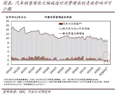 ?近期汽車銷售增速大幅下滑,對總消費增速的影響不可小覷。誠然,汽車消費本身具有較強的周期性——歷史上與信貸周期高度相關(guān),但本輪汽車消費大幅滑坡的背后還有一些其它的因素。高頻數(shù)據(jù)顯示,8月汽車零售銷量增速進一步下滑至-6.9%[4]——我們預(yù)計,汽車銷售的大幅下滑可能拖累今年零售總額增速0.5-1個百分點,而其對即將公布的8月零售增速的影響會更為顯著。