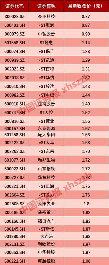 最新收盤價(jià)低于2元的30只個(gè)股