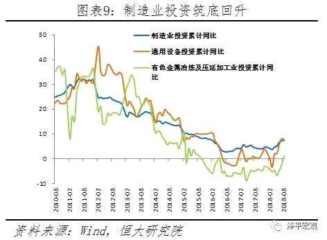 1-8月制造業(yè)投資同比上升,高技術(shù)裝備制造加快、傳統(tǒng)制造低迷。1-8月制造業(yè)投資同比7.5%,連續(xù)5個月回升,較上月和去年同期分別加快0.2和3個百分點。其中,高技術(shù)制造業(yè)、裝備制造業(yè)投資同比分別增長12.9%和9.2%,增速分別比全部投資快7.6和3.9個百分點。通用制造、專用設(shè)備制造、金屬制品投資分別同比增長7.7%、12.1%和16.6%,較1-7月放緩0.4、0.1和0.4個百分點,整體增速仍較高。汽車制造投資增長2.8%,放緩3.9個百分點。傳統(tǒng)行業(yè)如有色投資累計同比1.2%,醫(yī)藥制造、化學(xué)制品投資同比增長均為-0.1%,相對低迷。