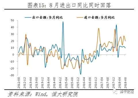 9、進(jìn)出口增速同落,搶出口效應(yīng)消失后出口將下滑9、進(jìn)出口增速同落,搶出口效應(yīng)消失后出口將下滑  8月進(jìn)出口增速同時回落,對美出口增速上升進(jìn)口增速下降。8月出口同比9.8%,較前值下降2.4個百分點,進(jìn)口同比20%,較上月大幅下降7.3個百分點。出口回落反映全球外需下滑,分國別看,除對美國、印度、加拿大、澳大利亞出口同比上升外,對其他經(jīng)濟體出口同比均下降;進(jìn)口大幅下降的原因在于人民幣貶值、內(nèi)需減弱和高基數(shù)等。
