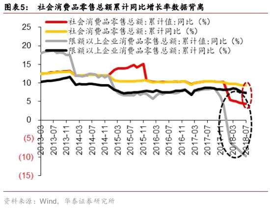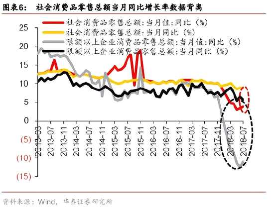統(tǒng)計(jì)局社會消費(fèi)品零售總額數(shù)據(jù)的統(tǒng)計(jì)對象是企業(yè)而非消費(fèi)者,因此,該數(shù)據(jù)下設(shè)限額以上單位的分項(xiàng)數(shù)據(jù),限額以上單位是指年主營業(yè)務(wù)收入2000萬元及以上的批發(fā)業(yè)企業(yè)(單位)、500萬元及以上的零售業(yè)企業(yè)(單位)、200萬元及以上的住宿和餐飲業(yè)企業(yè)(單位)。經(jīng)我們計(jì)算,限額以上社會消費(fèi)品零售總額同比增長率數(shù)據(jù)背離更大、背離時點(diǎn)更早。下圖顯示,限額以上社會消費(fèi)品零售總額同比增長率數(shù)據(jù)與其絕對值計(jì)算所得數(shù)據(jù)開始背離的時點(diǎn)在2017年10月份,此后該缺口逐步擴(kuò)大,8月,統(tǒng)計(jì)局發(fā)布的限額以上社零增速為6%,絕對值計(jì)算所得數(shù)據(jù)為-10.6%,缺口擴(kuò)大到近17個百分點(diǎn)。而社會消費(fèi)品零售總額同比增長率數(shù)據(jù)與其絕對值計(jì)算所得數(shù)據(jù)開始背離的時點(diǎn)在2018年2月份,明顯晚于限額以上數(shù)據(jù)背離的時點(diǎn),且截至8月份,缺口為約5個百分點(diǎn),明顯小于限額以上數(shù)據(jù)的背離缺口。為進(jìn)一步驗(yàn)證,我們由今年8月份的統(tǒng)計(jì)局公布的社會消費(fèi)品零售總額當(dāng)月值及其同比增長率計(jì)算去年8月份的基數(shù)為28937億元,與統(tǒng)計(jì)局公布的30329億元相差1392億元;而由今年8月份的統(tǒng)計(jì)局公布的限額以上社會消費(fèi)品零售總額當(dāng)月值及其同比增長率計(jì)算去年8月份的基數(shù)為11162億元,與統(tǒng)計(jì)局公布的13229億元相差2067億元,差額高于整體社零數(shù)據(jù),進(jìn)一步說明背離缺口主要由限額以上數(shù)據(jù)背離所導(dǎo)致。