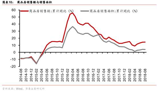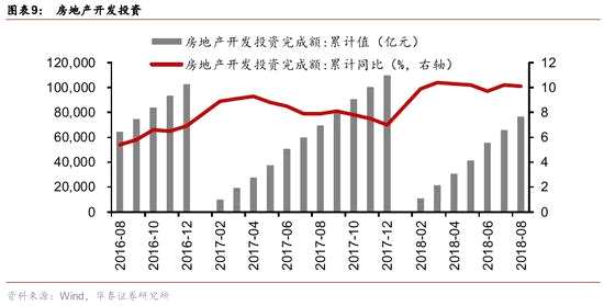 1-8月全國房地產(chǎn)開發(fā)投資76519億元,累計(jì)同比增速為10.1%,前值10.2%,較上月回落0.1個百分點(diǎn)。由于前期拿地收入滯后計(jì)入的影響,以及二季度之后有地產(chǎn)企業(yè)加速推盤的原因,18年以來地產(chǎn)投資數(shù)據(jù)增長較快,每月累計(jì)漲幅均超過9.5%。財(cái)政數(shù)據(jù)顯示,7月份土地出讓收入增速有所減緩,但是8月份有所回升,所以我們預(yù)計(jì)未來房地產(chǎn)開發(fā)投資下行的幅度不會太大。地產(chǎn)企業(yè)現(xiàn)金流較緊,企業(yè)加速推盤回款保開工保竣工,1-8月份房地產(chǎn)企業(yè)到位資金106682億元,同比增速6.9%,較7月增加0.5個百分點(diǎn),但房地產(chǎn)開發(fā)貸款和個人按揭貸款依然為負(fù)。商品房銷售額89396億元,同比增速14.5%,前值14.4%,商品房銷售面積102474萬平米,增速4%,較7月下降0.2%。我們預(yù)計(jì),未來房地產(chǎn)投資增速可能平緩回落。