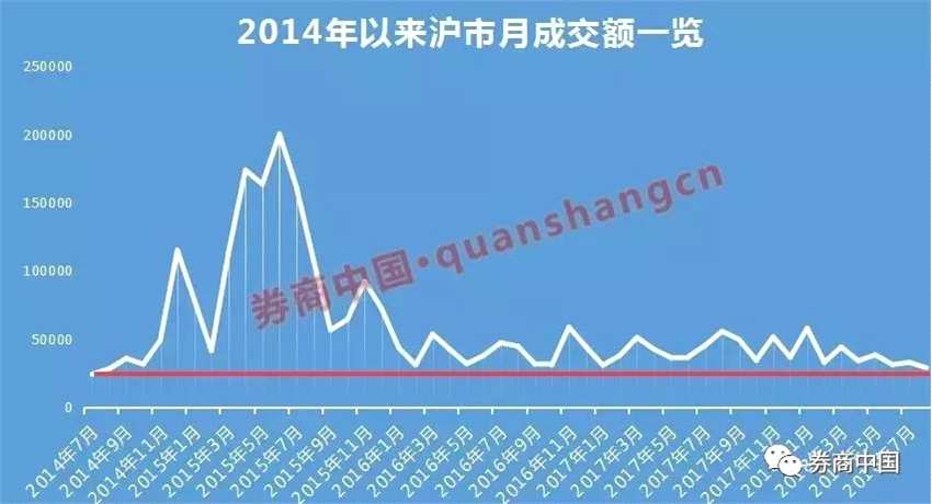 整體來看,滬市月成交額上一次低于3萬億還要追溯到2014年8月,當(dāng)時(shí)滬市月成交額為27897.14億元,但自2014年8月之后,滬市月成交額從未跌破3萬億。