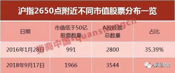時(shí)點(diǎn)回到兩年前——2016年1月28日,A股市場經(jīng)歷一輪快速下跌后,滬指跌破2700點(diǎn),報(bào)收2655.66點(diǎn),與今日2651.79點(diǎn)相差毫厘。但當(dāng)日50億市值以下的股票共有991只(占比35.39%),遠(yuǎn)低于今日的1966只。