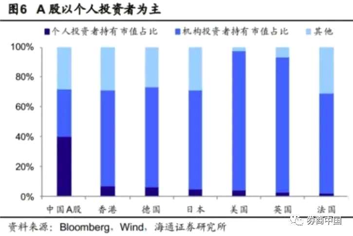 從全球股市投資者結(jié)構(gòu)來看,A股市場個(gè)人投資者占比仍然過高?!?a href="http://m.xfjyyzc.com/gegu/600837/" target="_blank" title="海通證券(600837)股票分析,新聞,資金流向,財(cái)務(wù)數(shù)據(jù)" >海通證券(600837)、股吧】統(tǒng)計(jì),2018年半年報(bào)數(shù)據(jù)顯示,A股個(gè)人投資者持有的自由流通市值占比達(dá)到40.5%,而其他主要資本市場中,中國香港、德國、日本、美國、英國和法國的個(gè)人投資者持有的總市值占比僅有6.82%、6.14%、4.59%、4.14%、2.74%和1.97%。