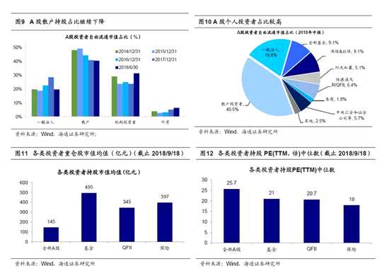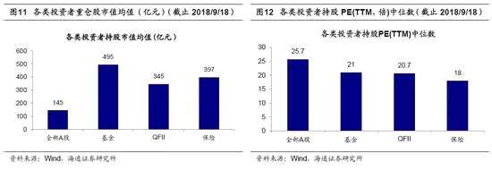 機(jī)構(gòu)投資者占比上升推動(dòng)龍頭效應(yīng)。18年以來龍頭效應(yīng)延續(xù),一方面源于實(shí)體經(jīng)濟(jì)中產(chǎn)業(yè)集中度持續(xù)上升,龍頭企業(yè)保持了較好的盈利狀況;另一方面則源于A股市場(chǎng)的投資者結(jié)構(gòu)變化。從這幾年的趨勢(shì)來看,2018年機(jī)構(gòu)投資者和外資占比繼續(xù)提高。2015年至今,A股散戶投資者自由流通市值持股占比總體呈下降趨勢(shì),從49%下降到2018Q2的約40%,而內(nèi)外資機(jī)構(gòu)持股占比從23.8%提高到31.3%,散戶占比下降,機(jī)構(gòu)占比上升的長期趨勢(shì)較為明顯。邊際增量資金影響市場(chǎng)風(fēng)格,相對(duì)于散戶,機(jī)構(gòu)投資者投資行為更加理性,機(jī)構(gòu)投資持股占比提高將強(qiáng)化龍頭股效應(yīng)。截止2018/9/18,基金、QFII、保險(xiǎn)的三季報(bào)重倉股市值均值分別為495億、345億、397億,遠(yuǎn)高于全部A股市值均值145億;基金、QFII、保險(xiǎn)的三季報(bào)重倉股PE(TTM)中位數(shù)分別為21倍、20.7倍、18倍,也低于全部A股估值中位數(shù)25.7倍,這也反映了機(jī)構(gòu)投資者更偏好低估值、大市值的龍頭企業(yè)。