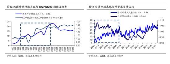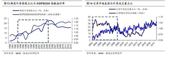 外資占比在上升,海外投資者更偏好龍頭。近幾年A股中外資投資占比也在不斷上升,目前A股中外資占自由流通市值比例約為6%,仍然遠(yuǎn)低于日本(2017)、臺(tái)灣(2017)、韓國(2013)市場(chǎng)中外資持股占比分別為30.1%、27.3%、15.9%,未來外資在A股中占比有望進(jìn)一步提升。參考韓國、臺(tái)灣的歷史經(jīng)驗(yàn),韓國外資持股占比提升最快的時(shí)期是1997-2005年,這時(shí)期韓國外資持股占比從9%提高到23%。在韓國外資持股比例不斷上升的時(shí)期,KOSPI200指數(shù)(韓國大盤藍(lán)籌指數(shù))/KOSPI指數(shù)的相對(duì)溢價(jià)從1.0提高到1.2,說明在外資持股占比提升過程中,大盤藍(lán)籌股代表的行業(yè)龍頭始終表現(xiàn)較好。具體來看,三星電子等半導(dǎo)體板塊龍頭成為境外投資者追捧的熱點(diǎn)。從臺(tái)灣經(jīng)驗(yàn)來看,2003-2008年期間臺(tái)灣外資持股比例從11%提高到25.8%,外資成交額占比從13.8%提高到約30%,這時(shí)期內(nèi)代表大盤藍(lán)籌股的臺(tái)灣50指數(shù)相對(duì)于臺(tái)灣加權(quán)指數(shù)溢價(jià)率在1以上,臺(tái)灣50指數(shù)表現(xiàn)相對(duì)較強(qiáng)。具體來看,外資進(jìn)入臺(tái)灣市場(chǎng)后,臺(tái)灣電子產(chǎn)業(yè)龍頭企業(yè)如鴻海、臺(tái)積電等個(gè)股相對(duì)臺(tái)灣加權(quán)指數(shù)溢價(jià)率不斷提高。
