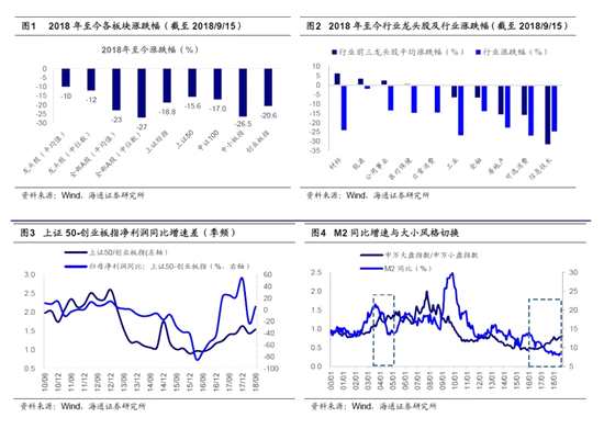 價(jià)值與成長差距小的原因是二者盈利差距縮小。我們?cè)谇捌趫?bào)告《價(jià)值龍頭攜手成長龍頭——論2018年市場(chǎng)風(fēng)格-20171219》中曾經(jīng)分析過,長周期視角看,A股中大小盤輪換一般是2-3年。從影響市場(chǎng)風(fēng)格的因素來看:首先,流動(dòng)性松緊對(duì)風(fēng)格影響不大,對(duì)整體行情影響更直接。一般印象是大盤價(jià)值股市值大,小盤成長股市值小,因此錢多時(shí)大票占優(yōu),錢少時(shí)小票占優(yōu)。從大趨勢(shì)看兩者確有這樣的相關(guān)性,但在04-05年、05-06年、08-09年、16年至今都出現(xiàn)過背離。其次,經(jīng)濟(jì)基本面對(duì)風(fēng)格有一定的影響,經(jīng)濟(jì)數(shù)據(jù)好轉(zhuǎn)時(shí)利于大盤價(jià)值股,大盤價(jià)值股整體偏金融、周期性行業(yè),在宏觀經(jīng)濟(jì)上行時(shí)金融和周期行業(yè)業(yè)績(jī)更佳,小盤股主要集中在消費(fèi)和科技領(lǐng)域,此類行業(yè)周期性偏弱,經(jīng)濟(jì)增速下行時(shí)業(yè)績(jī)?cè)鲩L相對(duì)有保障,但大小風(fēng)格和經(jīng)濟(jì)基本面也在2009-10年、2012年出現(xiàn)背離,即流動(dòng)性、經(jīng)濟(jì)增長與風(fēng)格的關(guān)系并不穩(wěn)定。長期來看,盈利趨勢(shì)才是影響風(fēng)格的核心變量,長周期來看基本面決定股價(jià)漲跌,盈利趨勢(shì)分化是風(fēng)格切換的分水嶺。無論是2013年開始的創(chuàng)業(yè)板牛市還是2016年1月底開始的大盤走強(qiáng),背后的核心變量都是盈利。16年1月底至2017年末大票占優(yōu)期間,上證50累計(jì)凈利潤同比增速從16Q1最低的-7.6%回升到17Q4的14%,上證50與創(chuàng)業(yè)板指累計(jì)凈利潤同比之差從16年Q1的-84.7%一路升至17年Q4的54%。而2018年以來,上證50與創(chuàng)業(yè)板指累計(jì)凈利潤同比之差從17Q4的54%回落至18Q2的5.7%,價(jià)值和成長股盈利差距變小,也是今年以來價(jià)值和成長風(fēng)格市場(chǎng)表現(xiàn)差異變小的重要原因之一。