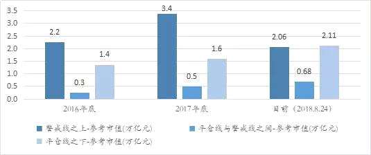 把質(zhì)押股分成三類:平倉線下(平倉規(guī)模)、平倉線和警戒線之間(有平倉風(fēng)險)和警戒線之上(較為安全)。比較分析看三個區(qū)塊的質(zhì)押次數(shù)和對應(yīng)的參考市值”的分布和占比可以得到三個結(jié)論: