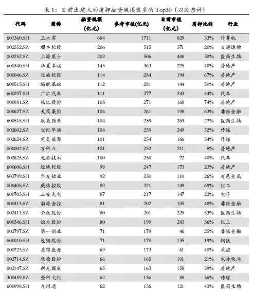 表1:目前出質(zhì)人的質(zhì)押融資規(guī)模最多的Top30(以股票計)