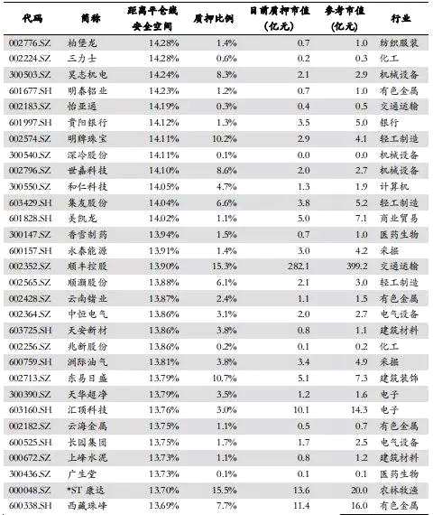 數(shù)據(jù)來源:wind,如是金融研究院  注:以距離平倉線的安全空間排序數(shù)據(jù)來源:wind,如是金融研究院  注:以距離平倉線的安全空間排序  表5:目前“平倉線與警戒線之間”相對最安全的質(zhì)押股Top30
