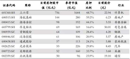 表3:目前“平倉線下”質(zhì)押個股的風(fēng)險Top10