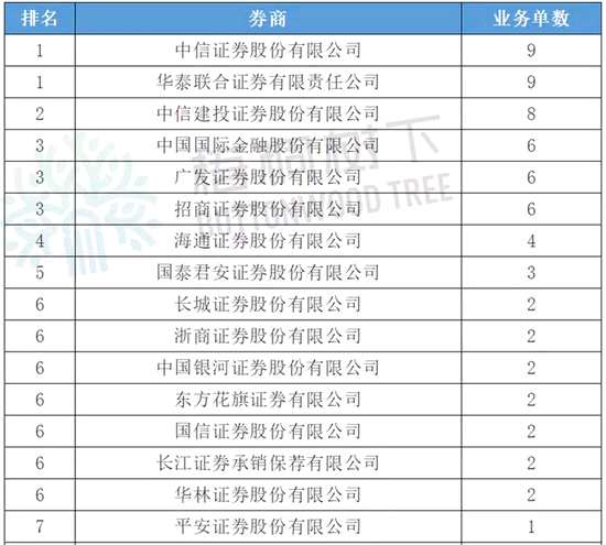 第三名:中國(guó)國(guó)際金融(6單)、廣發(fā)證券(6單)、招商證券(6單)。