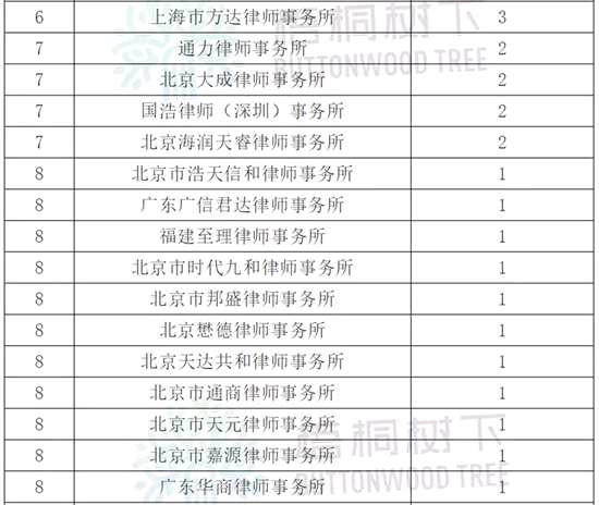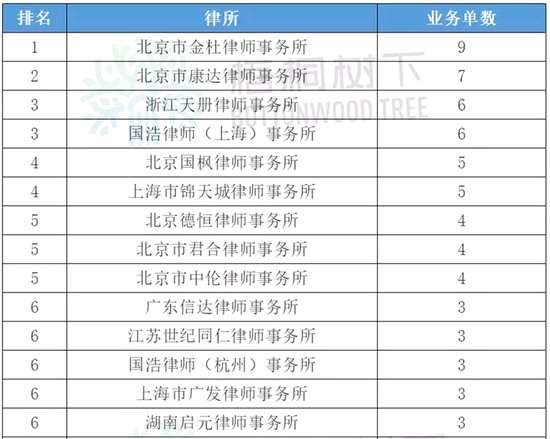 第三名:浙江天冊(cè)(6單)、國(guó)浩律師(上海)事務(wù)所(6單)。